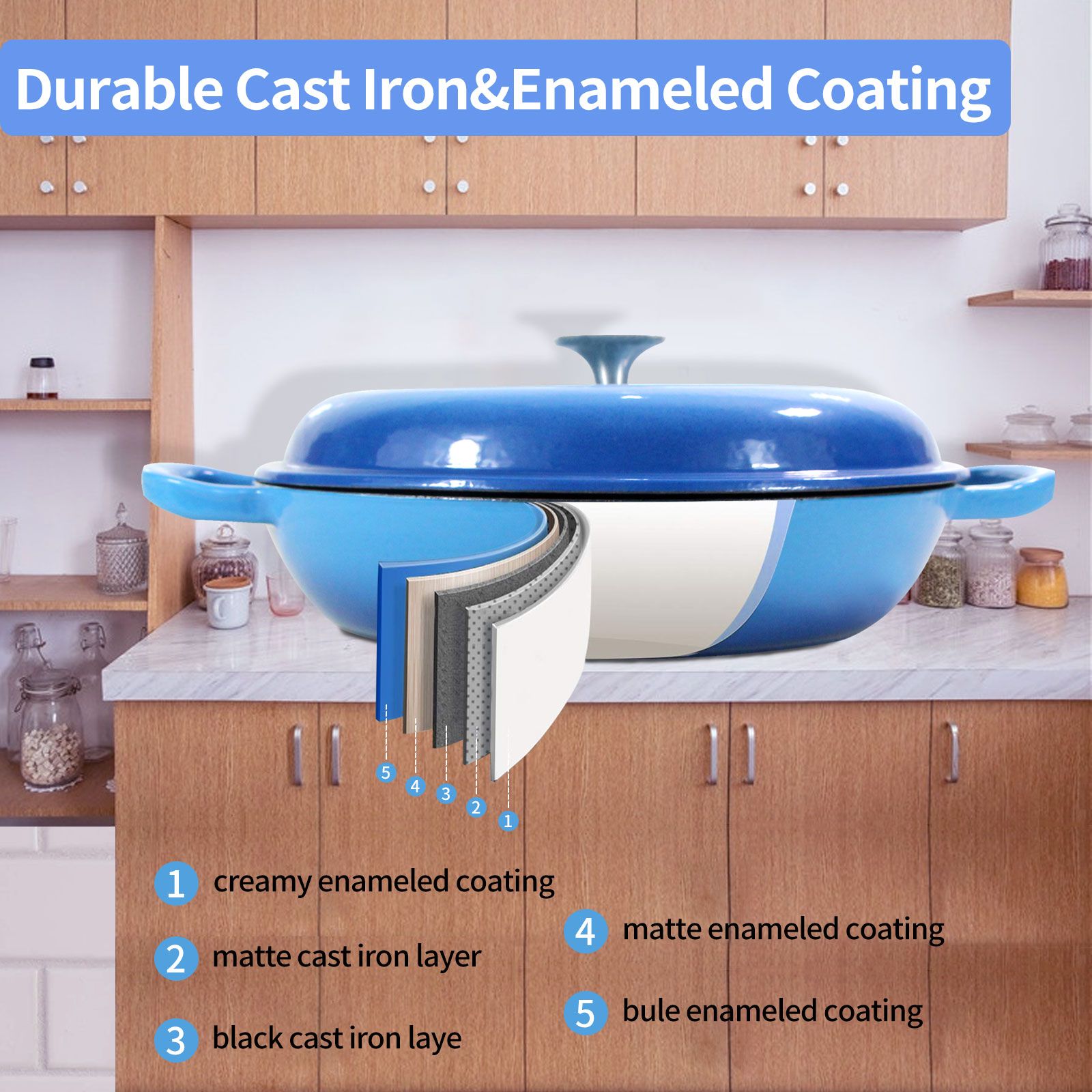 2.Porcelain Enamel Coating: The Cast Iron Braiser features smooth porcelain enamel coating,provides a great heat conductor. And it proven to effectively distribute & retain heat for an even & consistent temperature throughout the entire pot. Excellent for braise, bake, broil, saute, simmer, roast or a