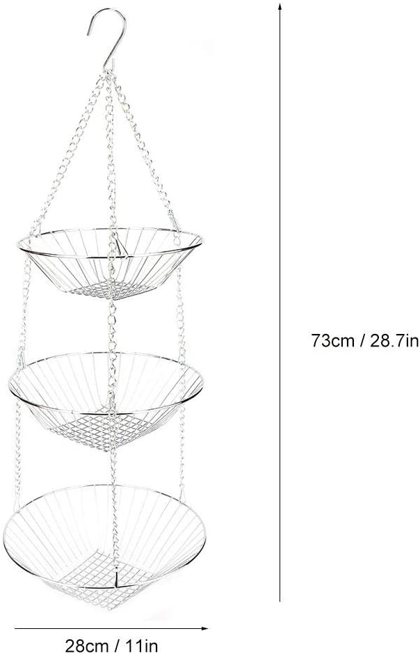 2.3-TIER BASKET STAND: The 3-tier kitchen basket stand is the perfect solution for kitchen storage. Simply store fruit & Vegetables, kitchen utensils, towels, cleaning products and more in the kitchen hanging storage basket.